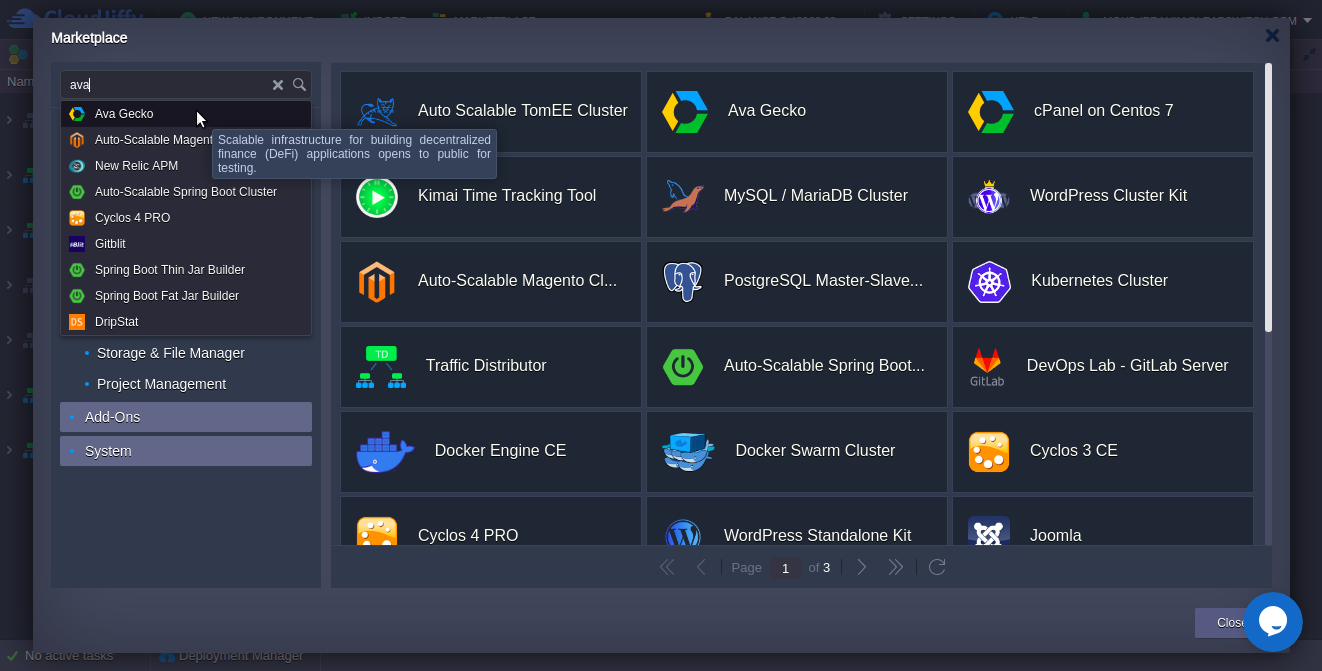 - One-Click: Installing AVA has never been easier. Just go to our Marketplace and click on Install. CloudJiffy will set up the platform and run it for you.