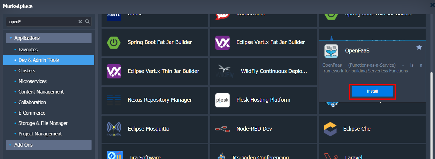 - Search for the OpenFaaS solution in the opened window.