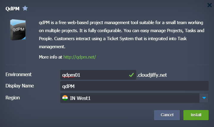Through the Cloudjiffy web interface, a qdPMinstance can be automatically deployed in a few clicks.