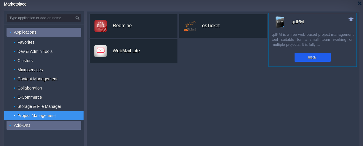 Step 3: A new window displaying the Apps will open, Select the “qdPM” instance and click on “Install”.