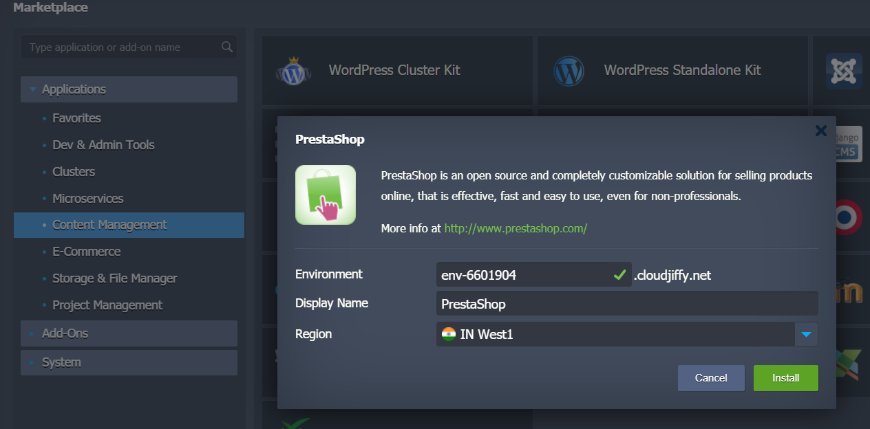 - Please change the Environment name and Display name as per your requirement and choose the location where you would like to host then click the Install button to start the application installation in the CloudJiffy environment.