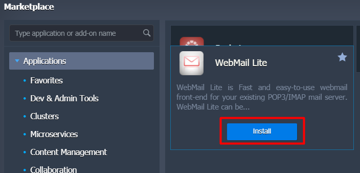 Step 3: A new window displaying the Apps will open, Select the “WebMail Lite” instance and click on “Install”.