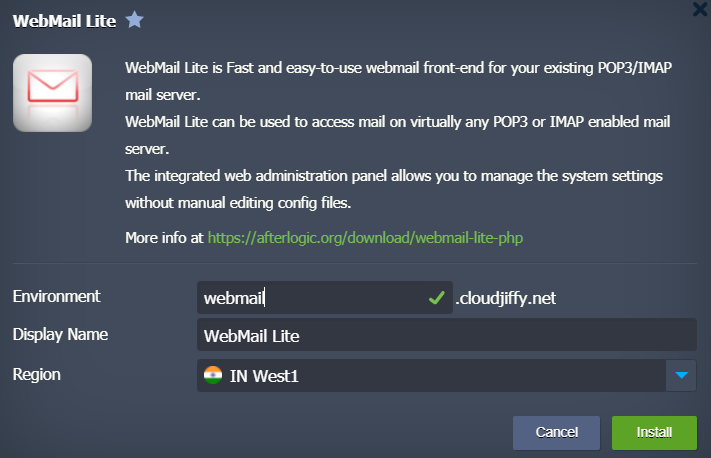 Through the Cloudjiffy web interface, a “WebMail Lite” instance can be automatically deployed in a few clicks.