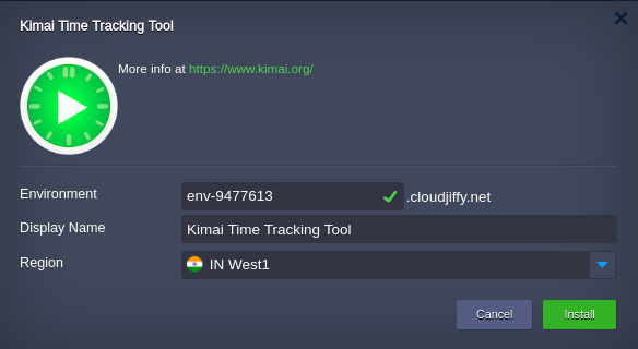 Step2: Search for Kimai and Give your environment a name and choose a location. We have 3 locations: India, Germany and the USA.